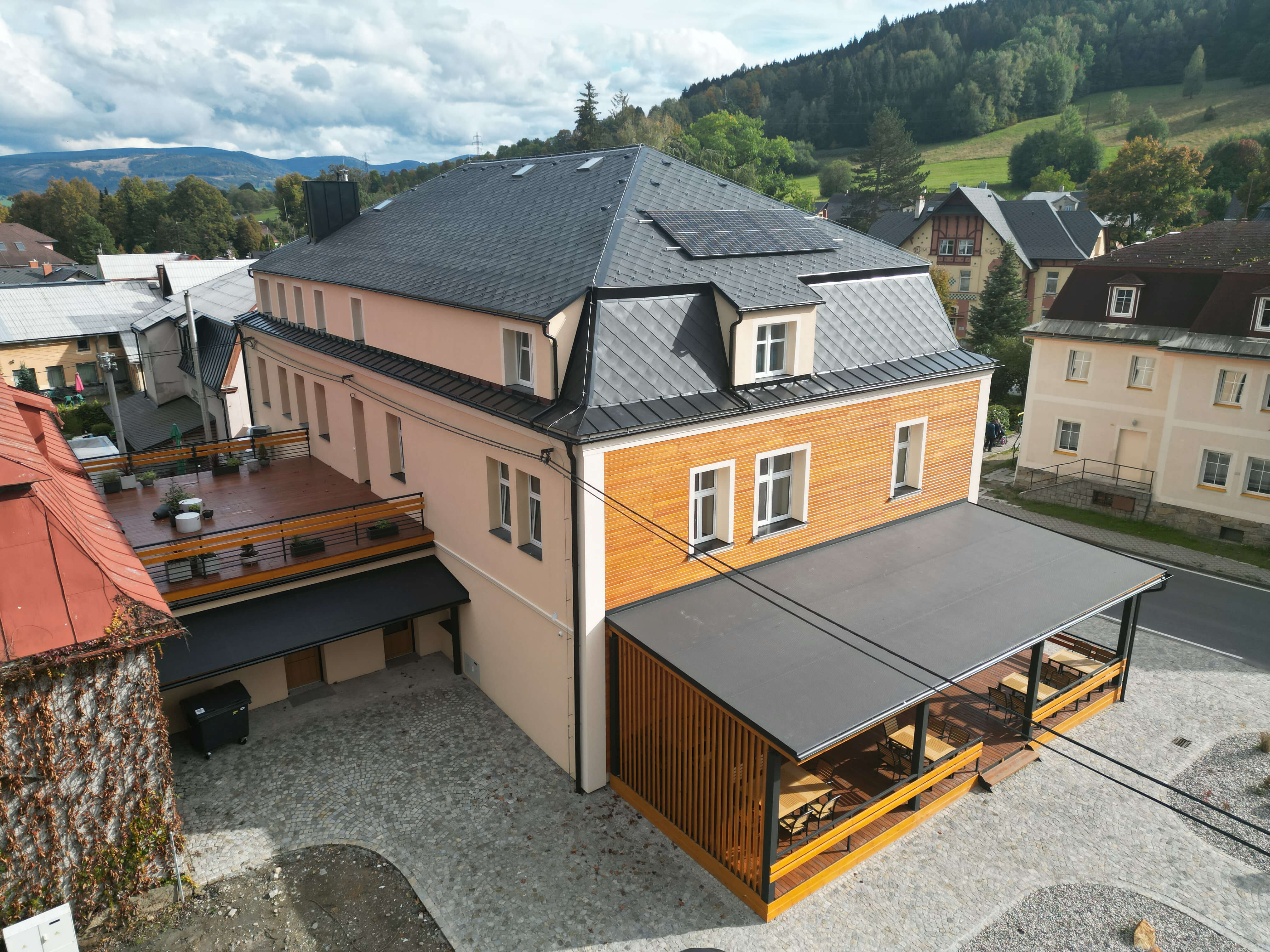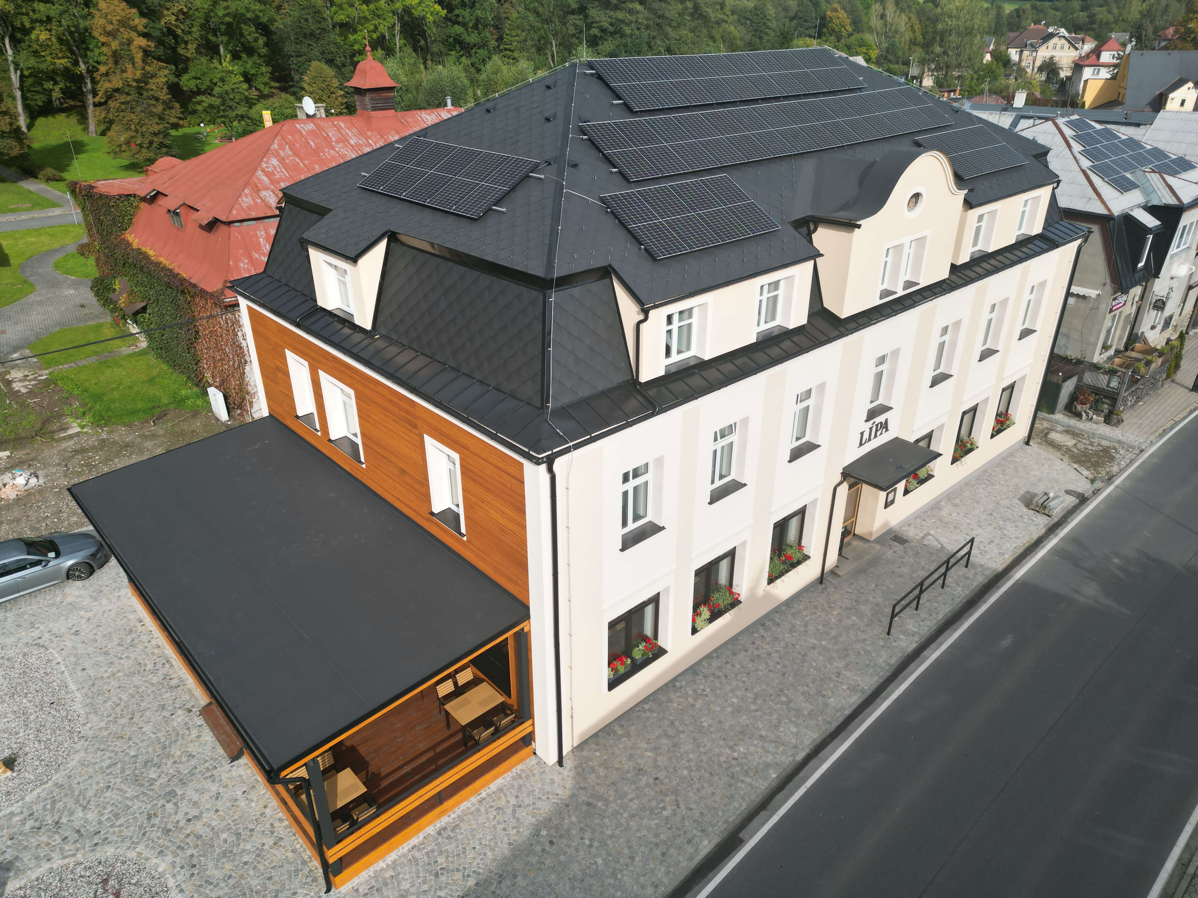 V rámci rekonstrukce střechy luxusního hotelu byla zvolena střešní krytina Fortega Flex 41. Tato krytina byla vybrána zejména díky svému přirozenému vzhledu, který respektuje charakter budovy, a zároveň díky moderním materiálovým vlastnostem vhodným pro dlouhodobý provoz hotelového objektu.