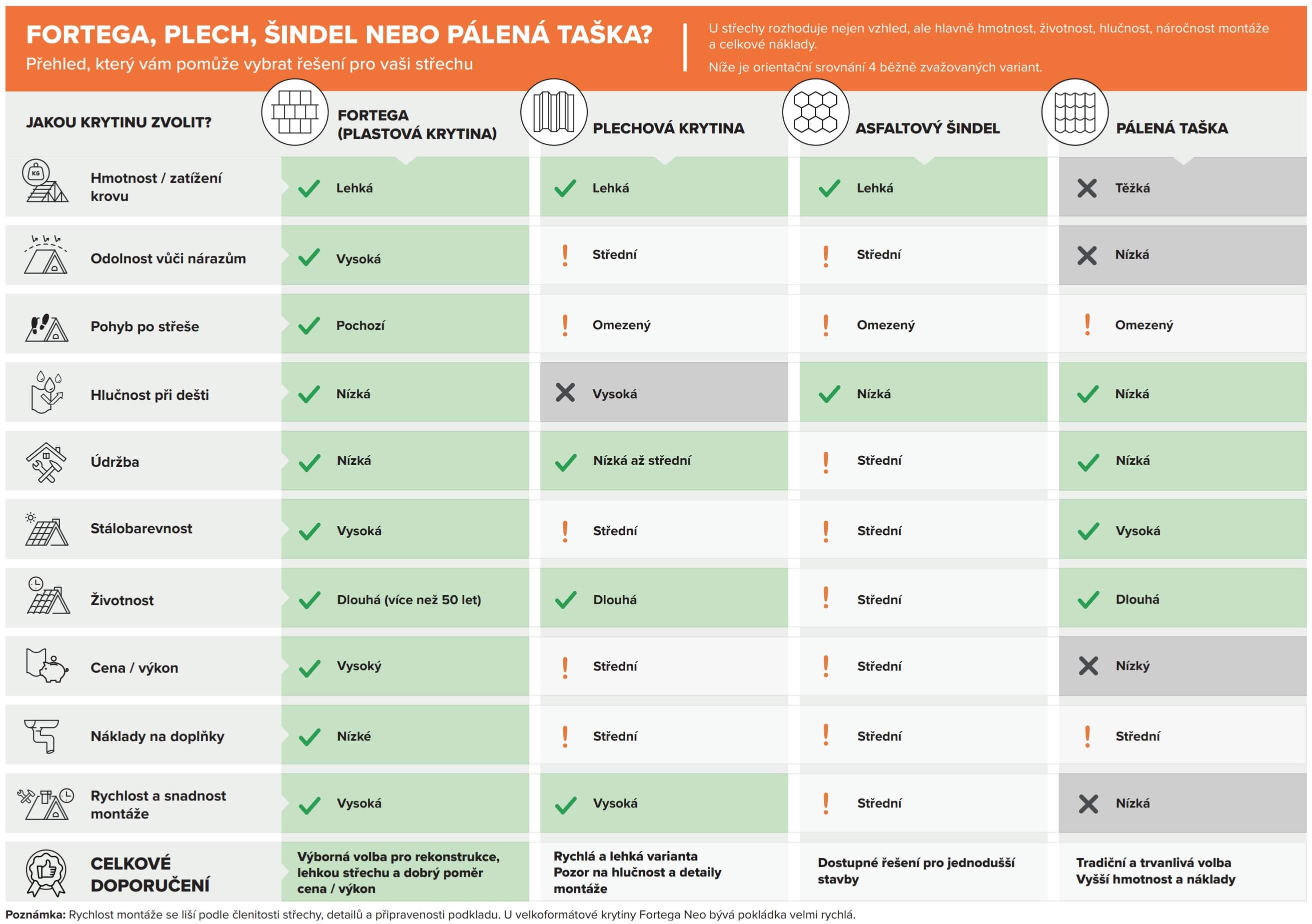 Při výběru střešní krytiny se nejčastěji porovnávají plech, tašky, šindele a vláknocement. Plech je sice lehký, ale hlučný a náchylný ke korozi či přehřívání, zatímco Fortega Neo nabízí lepší akustiku i tepelný komfort. Tašky jsou výrazně těžší a zatěžují krov, kdežto Fortega Neo je lehká, snadno se s ní manipuluje a nepraská. Oproti šindelům a vláknocementu vyniká delší životností, vyšší odolností a rychlejší pokládkou. Níže naleznete tabulku tabulku pro srovnání základních vlastností našich krytin s konkurenčními.