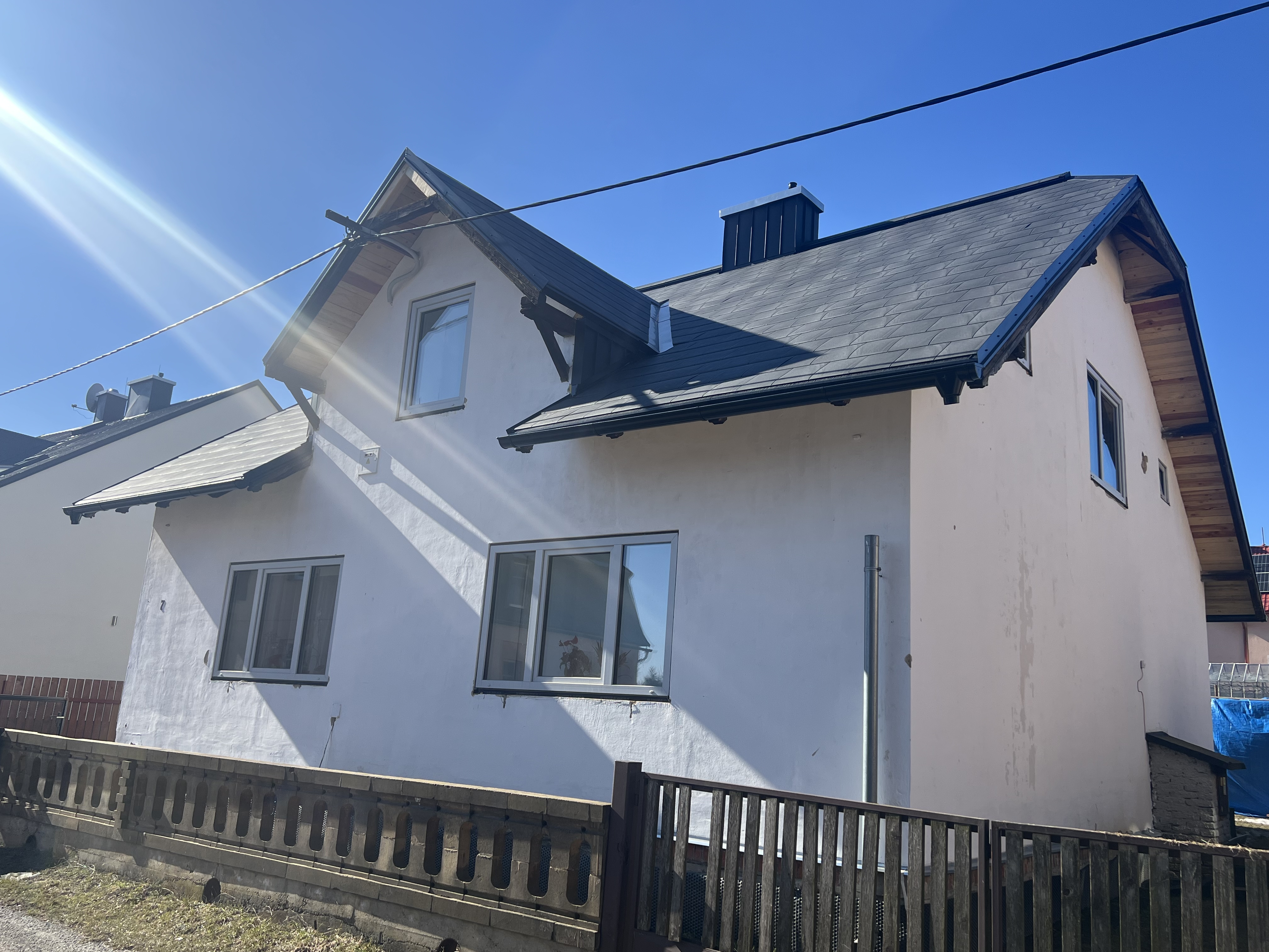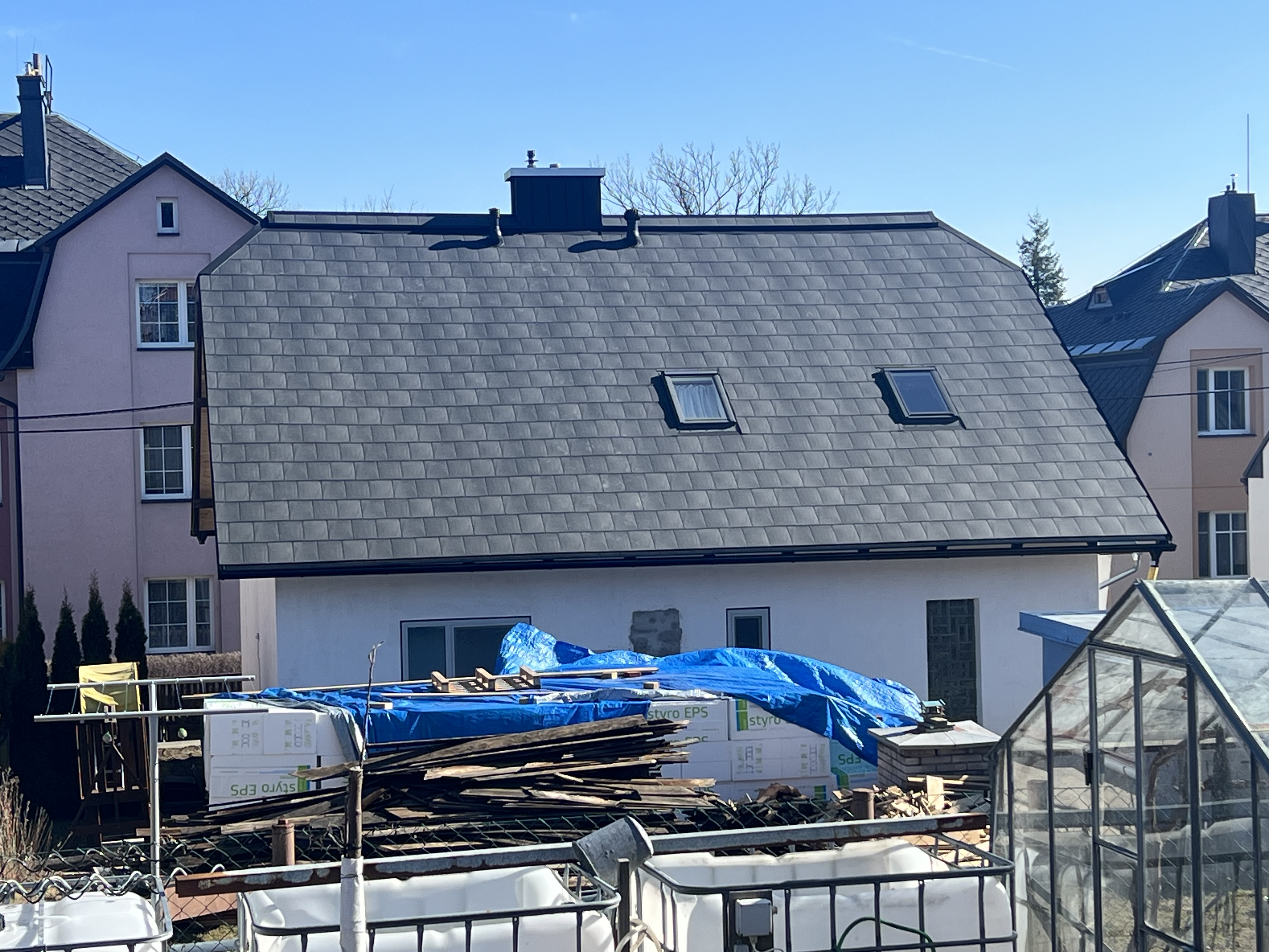 V rámci rekonstrukce střechy rodinného domu v Rýmařově byla zvolena velkoformátová kompozitní krytina Fortega Neo. Tato moderní krytina byla vybrána především pro svou extrémní odolnost v náročných klimatických podmínkách, které jsou pro tuto horskou oblast typické, ať už jde o prudké výkyvy teplot, silný vítr nebo vysokou sněhovou zátěž. Při rekonsktrukci byl použitý odvětrávací hřeben, který zajišťujefunkční odvětrání střesního pláště a zároveň bylo použito zateplení.