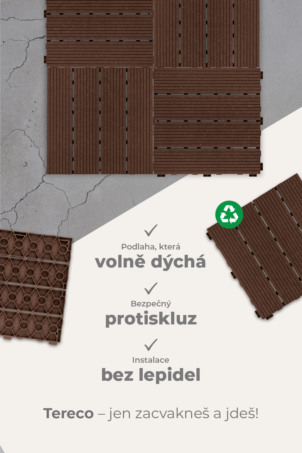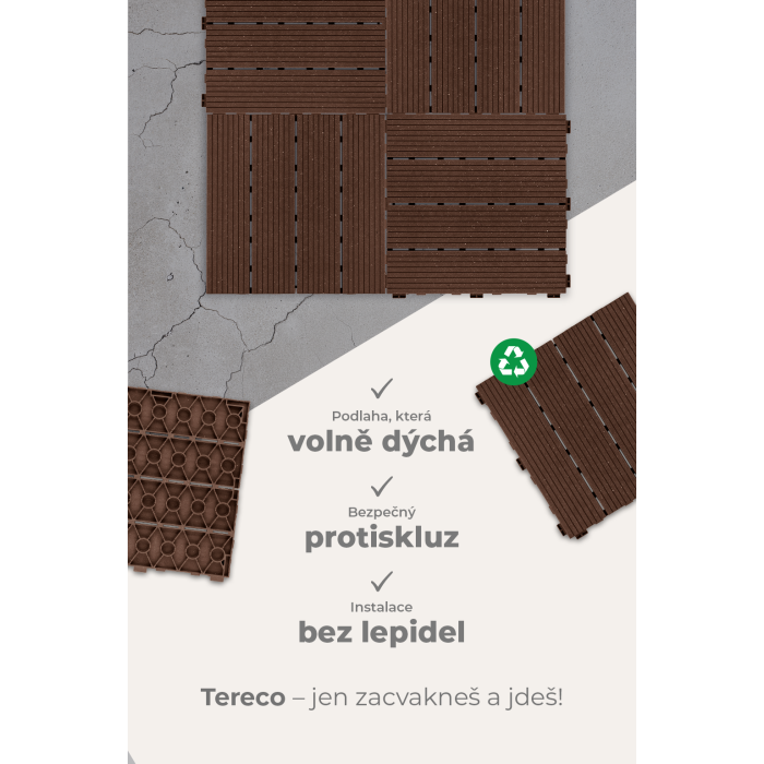 • Materiál: Tereco Wood je vyrobený ze 100 % recyklovaného plastu. Tímto přístupem chráníme přírodu a snižujeme ekologickou stopu.